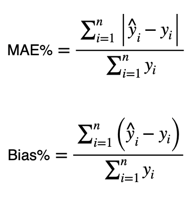 The model evaluation includes two primary accuracy metrics: Mean Absolute Error Percentage (MAE%) and Mean Bias Percentage (Bias%).